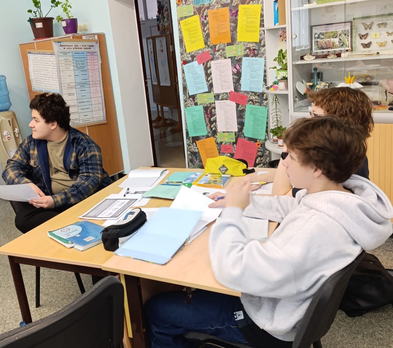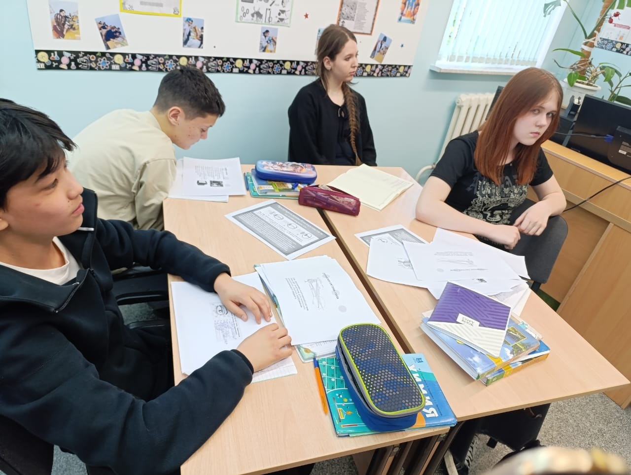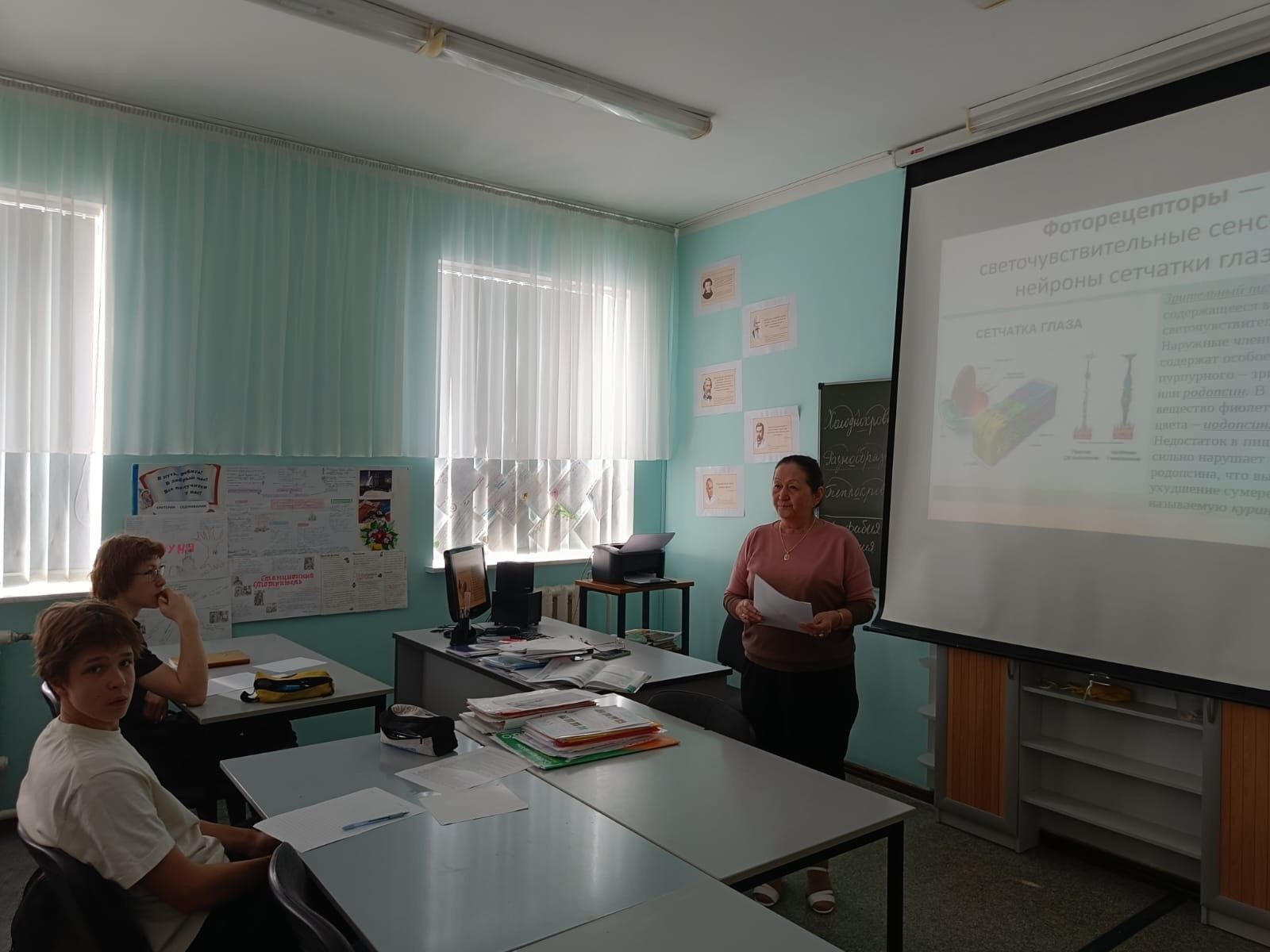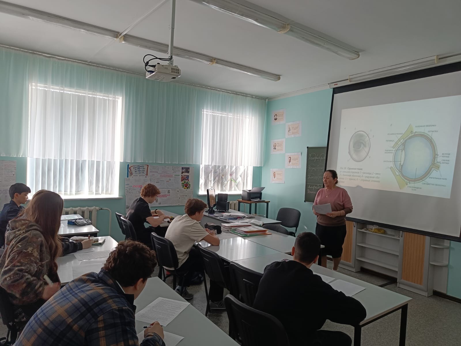 Первая часть урока проведена учителем биологии, она посвящена строению глаза, функциям. Субботина Любовь Николаевна провела экскурс в зоологию, вспомнили какие глаза имеют различные животные. Остановились на особенностях зрения человека. Использовали таблицу, модели глаза, мозга, череп. Ребята работали в группах, выполняли задания по карточкам группой и индивидуально, выполнили тестовые задания. Эстафету принял Надеин Олег Анатольевич, он разбирал с учащимися строение глаза с точки зрения физики, на схеме объяснил как получается изображение внутри глаза и что видим мы, почему глаз -это оптический прибор. Обратил внимание на нарушения зрения и как их можно исправить. Далее учащиеся с учителем математики Гоман Галиной Валентиновной рассчитали фокусное расстояние. Обратили внимание на каком расстоянии от глаза должна быть книга при чтении. Учитель русского языка Оспанова Нагима Биржановна подобрала текст по гигиене зрения. Ребята проработали его, нашли в нем односоставные предложения и написали эссе. В ходе занятия ребята научились делать гимнастику для глаз. С таким всесторонним подходом восьмиклассники тему усвоили отлично.